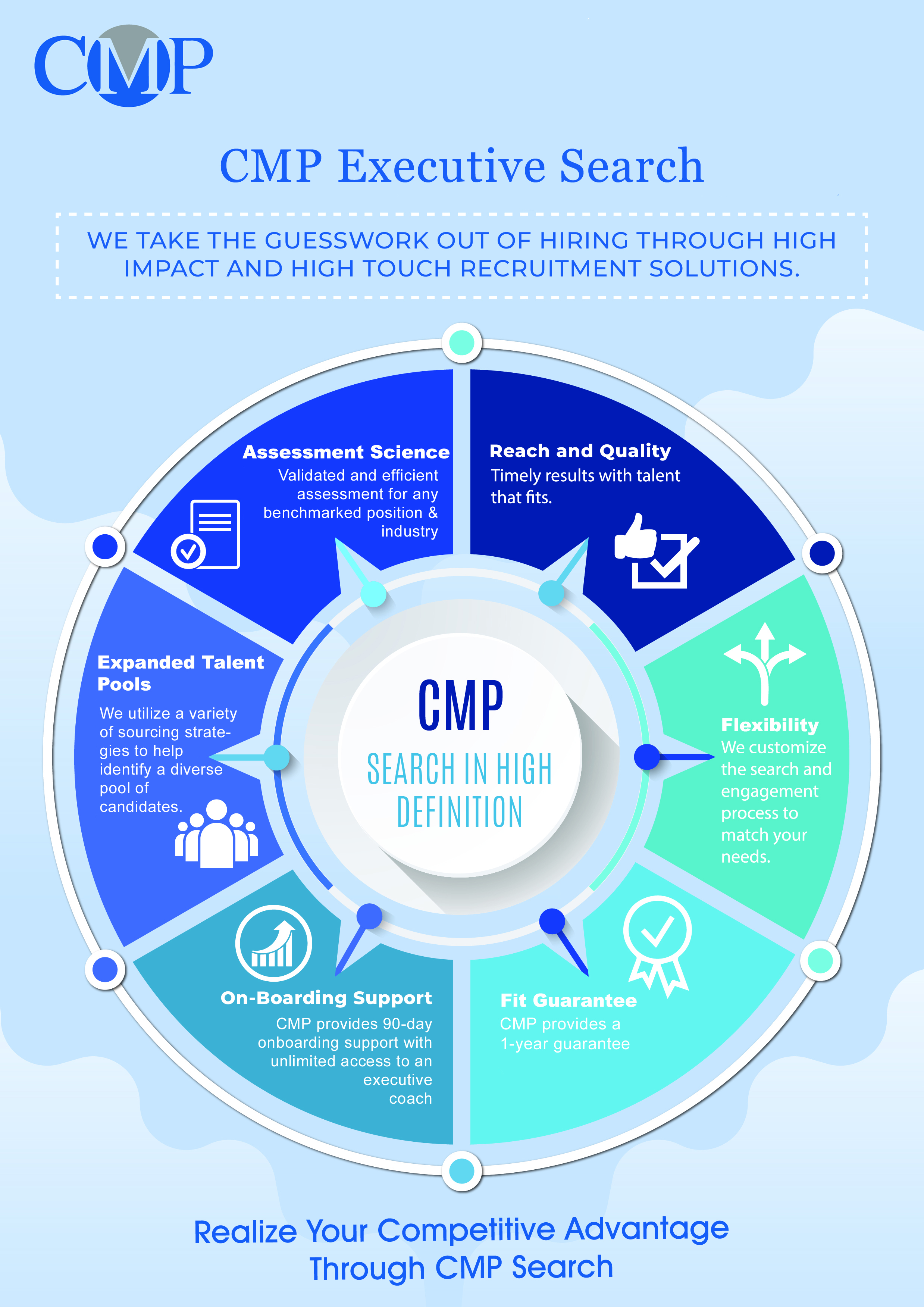 CMP's 3-prong approach includes a proven search process, customized assessments and a 90-day on-boarding program solving our client’s critical hiring needs and providing a 1-year guarantee.